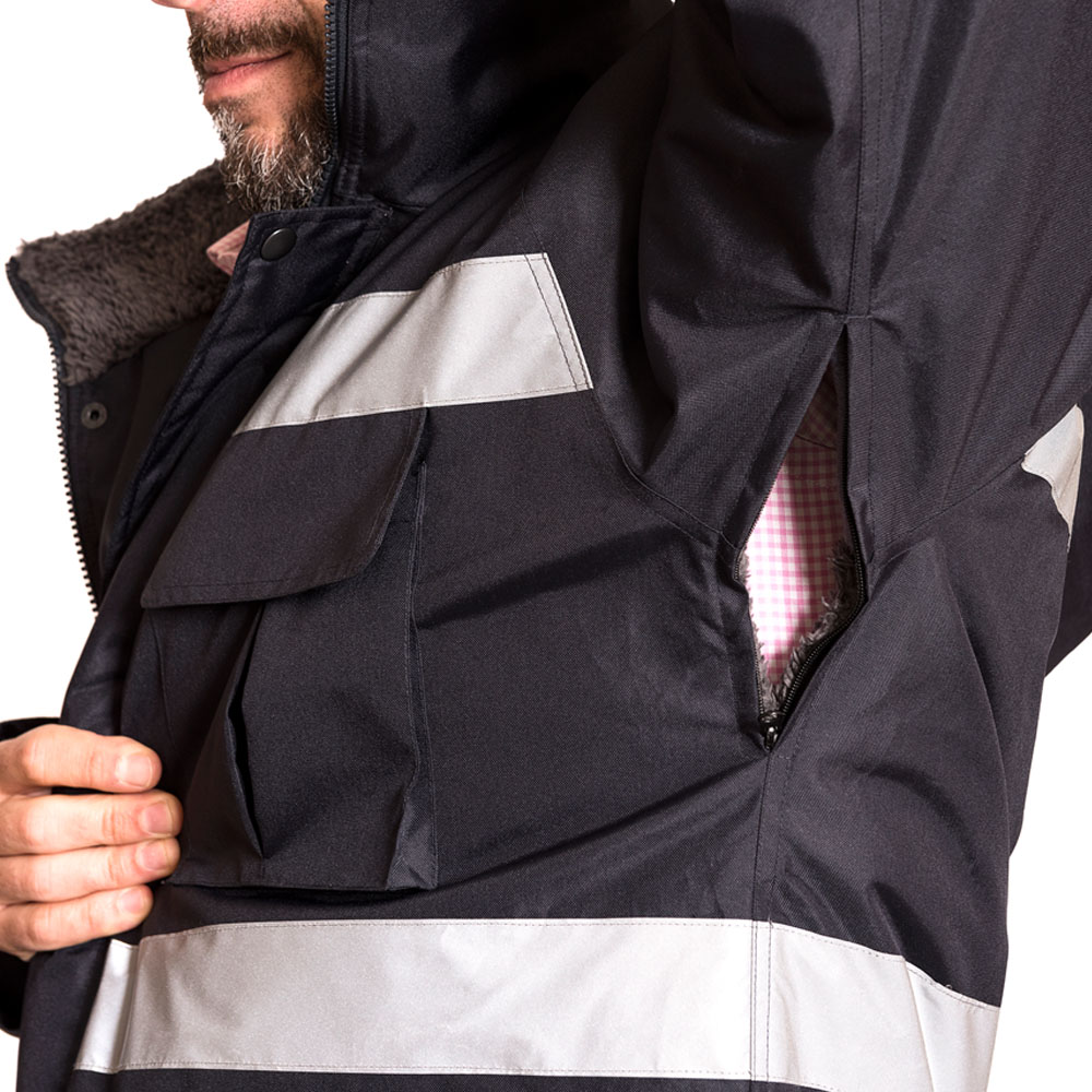 Fabricado en Oxford 300 D, material de alta duración formulado para mayor resistencia al desgaste causado por el uso. Producto diseñado con un aislante térmico que se adapta a bajas temperaturas y Humedad por su impermeabilidad media, ventilación bajo el brazo con cierre, Forro de corderito polar y abrigo en Guata de 140 Grs. Cuenta con dos líneas de cinta reflectante de 5 cm. en pecho y espalda. Gorro con cordón de ajuste, el cual se guarda bajo el cuello de la prenda. Provisto de 4 bolsillos tipo cargo y 2 tipo canguros delanteros de fácil acceso para mayor funcionalidad de la prenda.