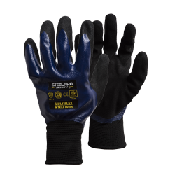 Guante tejido de puño elastizado con doble baño en Nitrilo, el primer baño completo de Nitrilo le aporta la mayor tenacidad a la penetración del líquido y el segundo baño Nitrilo Sandy (arenado) le aporta un Grip iniguala-ble en contacto con superficies oleosas, diseñados para trabajos en ambientes agresivos; el Nitrilo proporciona una excelente durabilidad en tareas donde exista mucha abra-sión, tiene una alta resistencia al contacto de superficies con derivados de hidrocarburos como aceites y grasas.