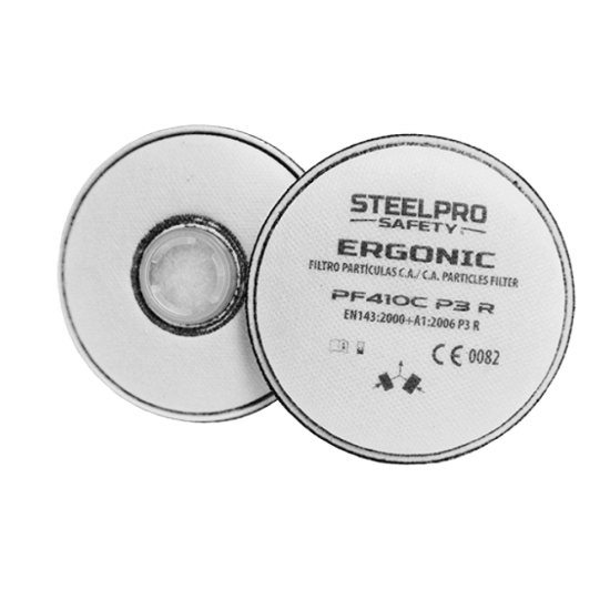 El filtro ERGONIC PF410C P3 R protege al usuario de partículas y cuenta con carbón activado. P3 corresponde a protección contra aerosoles sólidos