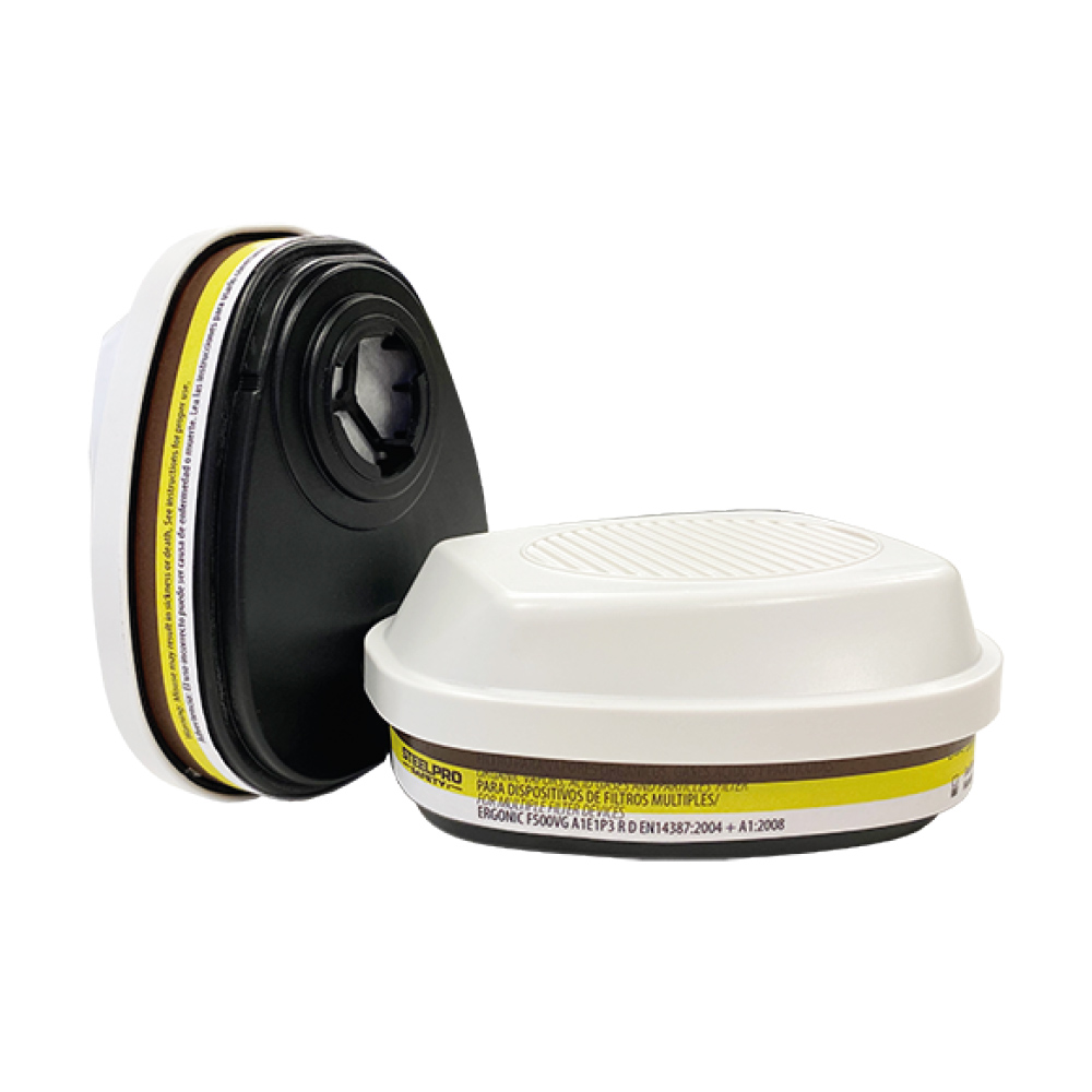 El filtro ERGONIC F500VG A1E1 protege al usuario de gases ácidos y vapores orgánicos. Es compatible con los respiradores ERGONIC de medio rostro 100 y 200S, y de rostro