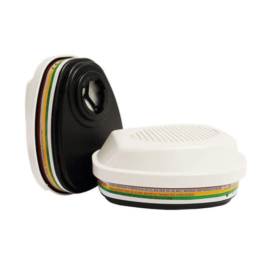 El filtro ERGONIC F500MP3 ABEK1 P3 RD es un filtro mixto (multigas y partículas) que protege al usuario de vapores orgánicos (VO), dicloro (Cl2), ácido sulfúrico (H2S), cianuro