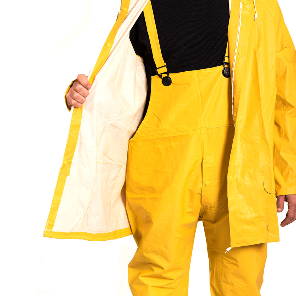 Conjunto de dos piezas (chaqueta con gorro incorporado y jardinera), Tela anti desgarro de alta resistencia, 100% impermeable, broches a presión, Esclavina para ventilación en espalda. Costuras selladas electrónicamente por alta frecuencia, suspensor elástico con hebilla de ajuste, cinta reflectiva en espalda