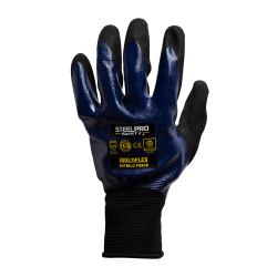 Guante tejido de puño elastizado con doble baño en Nitrilo, el primer baño completo de Nitrilo le aporta la mayor tenacidad a la penetración del líquido y el segundo baño Nitrilo Sandy (arenado) le aporta un Grip iniguala-ble en contacto con superficies oleosas, diseñados para trabajos en ambientes agresivos; el Nitrilo proporciona una excelente durabilidad en tareas donde exista mucha abra-sión, tiene una alta resistencia al contacto de superficies con derivados de hidrocarburos como aceites y grasas.