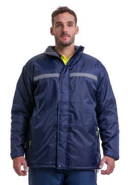 CARACTERÍSTICAS COLOR AZUL TELA Oxford 200D PU Coating Guata 180 gr (cuerpo), 150 gr (mangas) INTERIOR MATELASEADO EN ROMBOS CAPUCHA REPLEGABLE CINTA REFLECTIVA 1 EN PECHO Y ESPALDA AJUSTES EN CINTURA Y GORRO BOLSILLOS CON CIERRES AJUSTE DE MANGA CON VELCRO